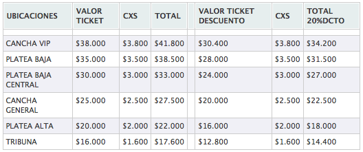 Los valores de las entradas, según ubicación, son los siguientes: