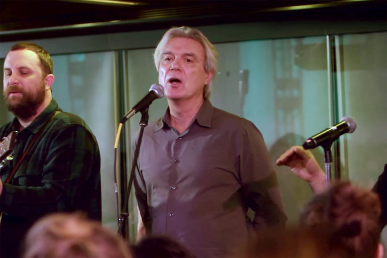 En una nueva actuación de Choir! Choir! Choir!, el ex líder de Talking Heads interpretó el clásico tema del fallecido músico británico en el lobby del Teatro Público de la Fundación Ford, en la ciudad de Nueva York.