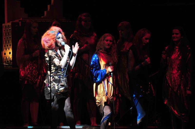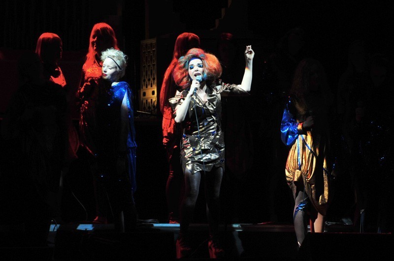 Puntualmente a las 21:30 horas Björk apareció con una gran peluca naranja y un vestido metálico. Junto a ella casi veinte coristas del grupo Graduale Nobili, el baterista/percusionista Manu Delago y Max Weisel, músico a cargo de los teclados y sintetizadores, quienes ocuparon sus lugares en el escenario que también contó con cinco pantallas en las que desfilaron hipnóticas imágenes (desde microscópicas células hasta el infinito del universo), muy importantes desde el inicio con «Cosmogony».