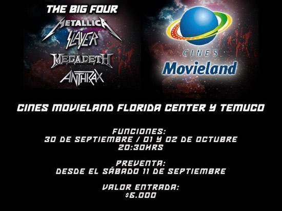 La histórica presentación que realizaran los cuatro estandartes del thrash de los ’80 –Metallica, Anthrax, Megadeth y Slayer- el pasado 22 de junio en el Festival Sonisphere en Sophia, Bulgaria, frente a 80 mil espectadores, será proyectada en Chile por la cadena de cines Movieland en Santiago y Temuco los días 30 de septiembre, 1 y 2 de octubre, a las 20.30 horas.