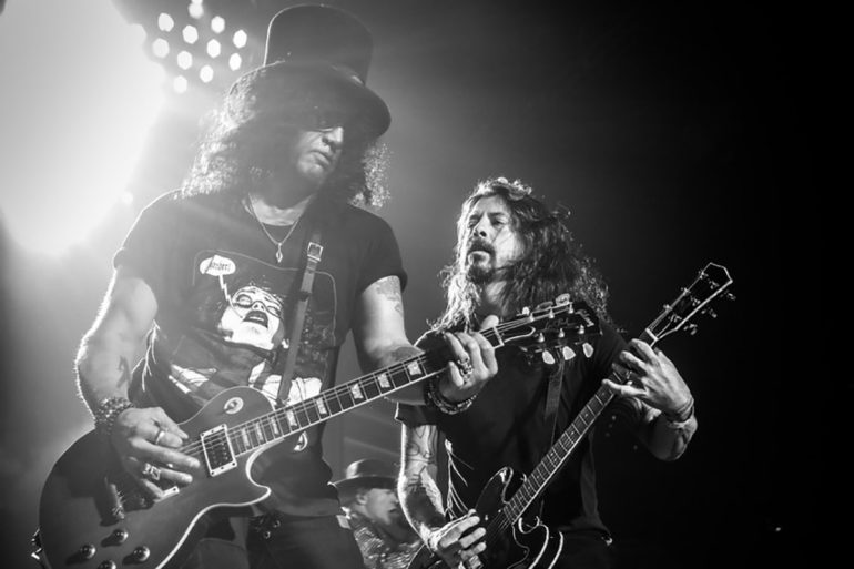 El líder de los Foos acompañó con su guitarra y su voz el tema de Appetite for Destruction, compartiendo efusivamente con Rose, Slash y Duff McKagan.