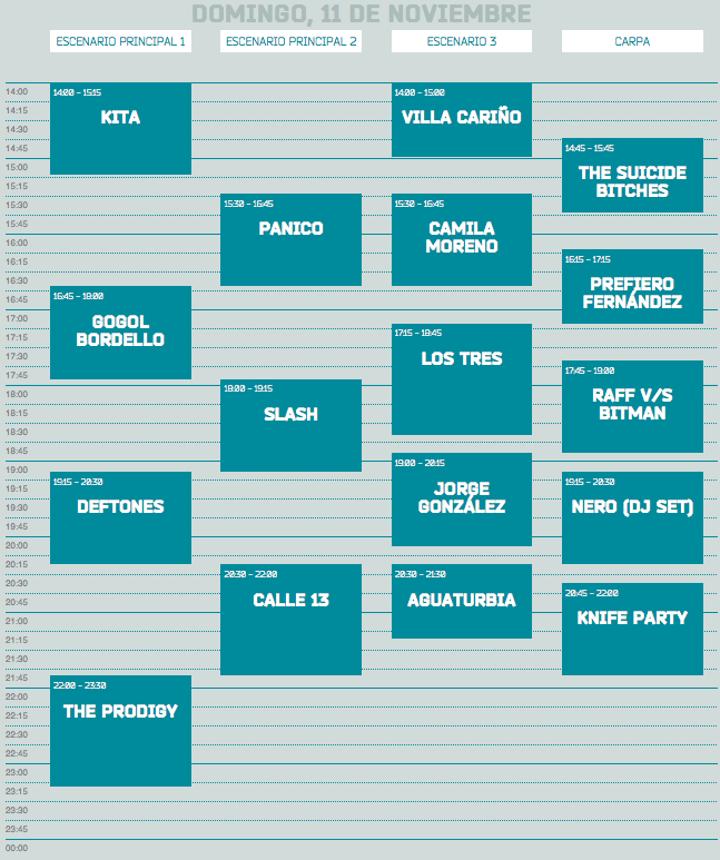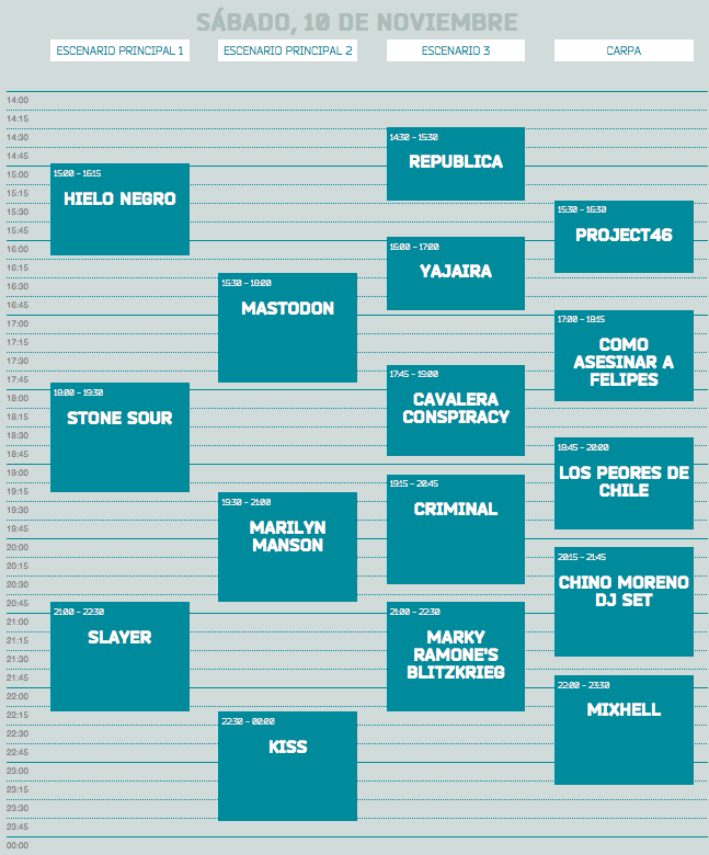De esta manera, el sábado 10 de noviembre alternarán sus shows Project 46, Hielo Negro, Mastodon, Stone Sour, Marilyn Manson, Slayer y KISS. El domingo en tanto, el festival abrirá con Pánico para seguir con Gogol Bordello, Slash, Deftones, Calle 13 y finalizar con The Prodigy.