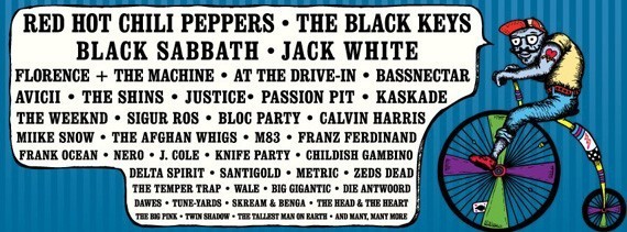 Black Sabbath, Red Hot Chili Peppers, The Black Keys, Jack White, Florence + the Machine, At the Drive-In, Avicii, The Shins, Justice, Passion Pit, Sigur Rós, The Weeknd, M83, Miike Snow, The Afghan Whigs, Bloc Party, Franz Ferdinand, Frank Ocean, J. Cole, Childish Gambino, Delta Spirit, Metric, The Temper Trap, Wale, Die Antwoord, Dawes, tUnEyArDs, The Head & the Heart, The Big Pink, Twin Shadow, The Tallest Man on Earth, Toro y Moi, Dr. Dog, Of Monsters and Men, Gary Clark Jr., Alabama Shakes, The Gaslight Anthem, Amadou & Mariam, Band of Skulls, SBTRKT, Tame Impala, The Walkmen, JJ Grey & Mofro, fun., Neon Indian, Dum Dum Girls, Washed Out, Aloe Blacc, Trampled by Turtles, Bear in Heaven, Blind Pilot, Chairlift, The Black Angels, Yellow Ostrich, Givers, Polica, Bombay Bicycle Club, Sharon Van Etten, White Rabbits, Doomtree, Macklemore & Ryan Lewis, The Devil Makes Three, Oberhofer, The War on Drugs, Michael Kiwanuka, O Rappa, Bowerbirds, Orchard Lounge, Mona, The Growlers, Hey Rosetta!, JEFF the Brotherhood, Anamanaguchi, First Aid Kit, Wax, FIDLAR, JC Brooks & the Uptown Sound, Milo Greene, Los Jaivas, Kopecky Family Band, The Jezabels, LP, Yuna, Walk Off the Earth, Animal Kingdom, Dev, The Sheepdogs, The Dunwells, DJ Mel, Empires, Kevin Devine, Dry the River, Helena, Haley Reinhart, Imaginary Cities, Overdoz, Ambassadors, DJ Zebo, Chancellor Warhol, Laura Warshauer, Red Oblivion, Perry’s stage, Bassnectar, Kaskade, Calvin Harris, NERO, Santigold, Knife Party, Zeds Dead, Big Gigantic, Skream & Benga, Little Dragon, Porter Robinson, Sub Focus, Madeon, Zedd, Paper Diamond, Totally Enormous Extinct Dinosaurs, Star Slinger, Badastrom, DJ Nihal, SALVA, Kid Color.