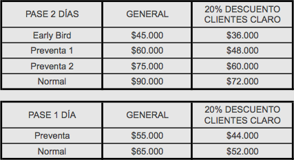 Los clientes de la empresa de telefonía Claro podrán disfrutar de un 20% de descuento exclusivo en la compra de entradas. A partir de las 21 horas del domingo 19 de agosto, ellos deberán ingresar al sitio web de la compañía, en donde podrán descargar un código para hacer efectivo el descuento.