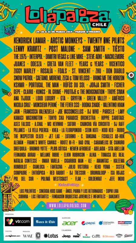 KENDRICK LAMAR – ARCTIC MONKEYS – TWENTY ØNE PILØTS – LENNY KRAVITZ – POST MALONE – SAM SMITH –– TIËSTO – THE 1975 – INTERPOL – DIMITRI VEGAS & LIKE MIKE – STEVE AOKI – MACKLEMORE – JUANES – ODESZA – GRETA VAN FLEET – YEARS & YEARS – VICENTICO – ZIGGY MARLEY – ROSALÍA – FOALS – ST. VINCENT – ZHU – DON DIABLO – SNOW PATROL – CAETANO, MORENO, ZECA & TOM VELOSO – BRING ME THE HORIZON – KSHMR – PORTUGAL. THE MAN – RÜFÜS DU SOL – JORJA SMITH – FISHER – GEPE – CLAIRO – KUNGS – RL GRIME – PROTOJE & THE INDIGGNATION – TROYE SIVAN – ANA TIJOUX – LOUD LUXURY – GTA – GRYFFIN – GREEN VALLEY – AMÉRICO – NICOLA CRUZ – MONSIEUR PERINÉ – THE FEVER 333 – BOOKA SHADE – VALENTINO KHAN – JAIN – FRANCISCA VALENZUELA – JOE VASCONCELLOS – DJ WHO – PARCELS – LANY – KAMASI WASHINGTON – TOKYO SKA PARADISE ORCHESTRA – HIPPIE SABOTAGE – ASES FALSOS – A.CHAL – MC KEVINHO – SATORI – CHANCHA VÍA CIRCUITO – DJ RAFF – PILLANES – LA VELA PUERCA – KHEA – LA FLORIPONDIO – SEUN KUTI – KIDD KEO – RUBIO – THE INSPECTOR CLUZO – JETLAG – ZATURNO – C. TANGANA – FISKALES AD-HOK – ALEMÁN – FRANK’S WHITE CANVAS – ROOTZ HI-FI – BAD GYAL – CARAMELOS DE CIANURO – DREFQUILA – BRONKO YOTTE – PLAYA GÓTICA – NEWEN AFROBEAT – ADELAIDA – SITA ABELLÁN – FERNANDA ARRAU – MELANIE RIBBE – ELKIN ROBINSON – ALIKA – TOMASA DEL REAL – NATALIA CONTESSE – OMAR VARELA – CIGARBOX MAN – ILE – AMANITAS – KALEEMA – HUMBOLDT – GIANLUCA – FANTASNA – JULIO VICTORIA – KEKO YOMA – SISTEK – COMPADRE – ENTRÓPICA – RED RABBIT – DJ TRESSOR – DRUNVALOOP – ISA ROJAS – POL DEL SUR – POLIMÁ WESTCOAST – FLAK – GOLDENRAT – JEFE INDIO
