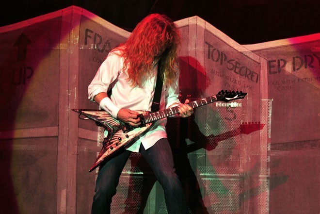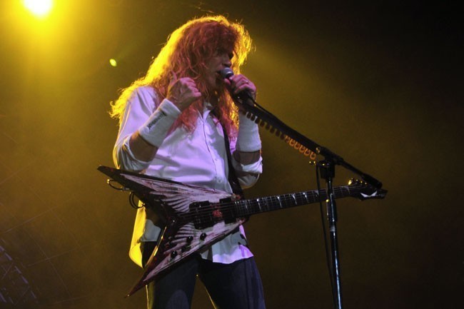 El público se encontraba impaciente, coreando el nombre de sus ídolos sin cesar, cuando a las 21 horas exactas, el Movistar Arena se oscurece para dar paso a los acordes del “Black Sabbath”, una intro que eriza los pelos, para que aparezcan uno a uno los miembros de Megadeth. Ya a estas alturas, el Arena se venía abajo… suenan los acordes de “Dialectic Chaos”, la instrumental que abre el nuevo disco Endgame, para desatar la euforia colectiva. “This day we fight!” continúa, para seguir con un verdadero clásico: “In my darkest hour” (canción dedicada a la memoria de Cliff Burton, el fallecido bajista de Metallica). Todo el recinto canta aquel himno. Realmente es increíble escuchar a un recinto completo cantar un tema a todo pulmón.