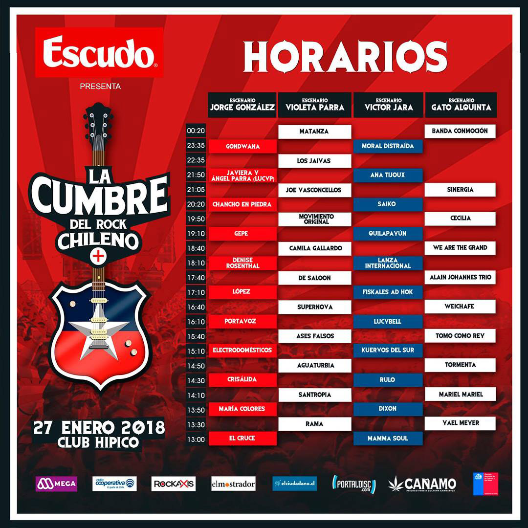 Cada vez falta menos para la quinta edición de La Cumbre del Rock Chileno y la organización dio a conocer la programación de los 43 artistas que se subirán a los cuatro escenarios que estarán preparados para entregar una jornada inolvidable este 27 de enero a partir de las 13:00 horas en el Clun Hípico.