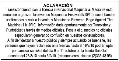 Daniela Zeballos, de la productora encargada del Maquinaria Festival, declaró en Radio Cooperativa que el SERNAC les solicitó publicar un inserto en un medio de circulación nacional «con el objeto de aclarar el tema de la licencia y el tema en que se iban a llevar a cabo los eventos y especificar que son distintos eventos», agregando que información de terceros y de medios no oficiales generaron confusión sobre Maquinaria Festival y el recital de Rage Against de Machine.
