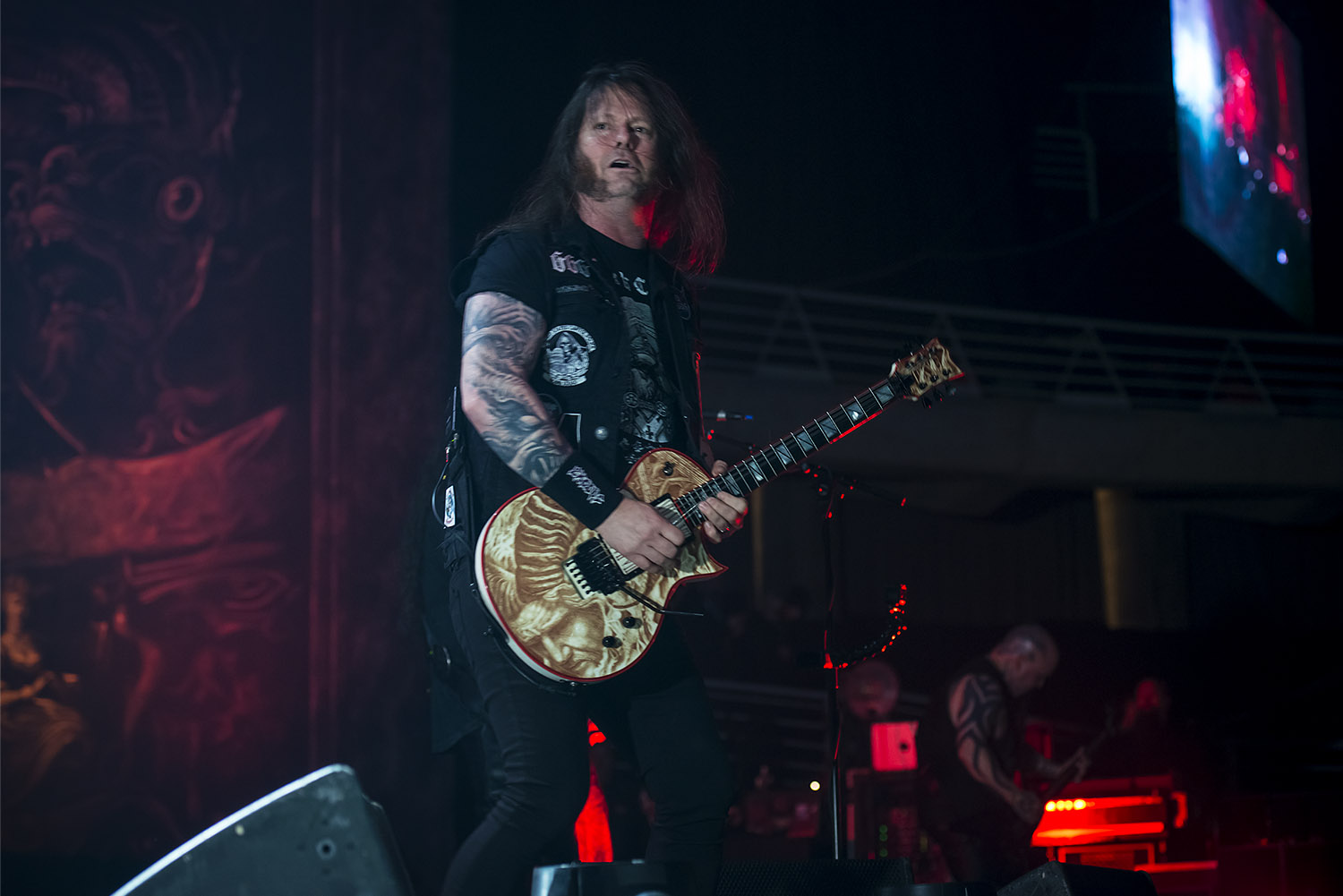 El final de la primera parte tuvo un doble combo demoledor, desplegando a la vez un nuevo telón en que apareció el logo del águila junto a dos cruces invertidas a cada lado, creando un ambiente perfecto para “Seasons in the Abyss” y la grandiosa “Hell Awaits”, con luces rojas que tiñeron el escenario, dando a todos la bienvenida al infierno.