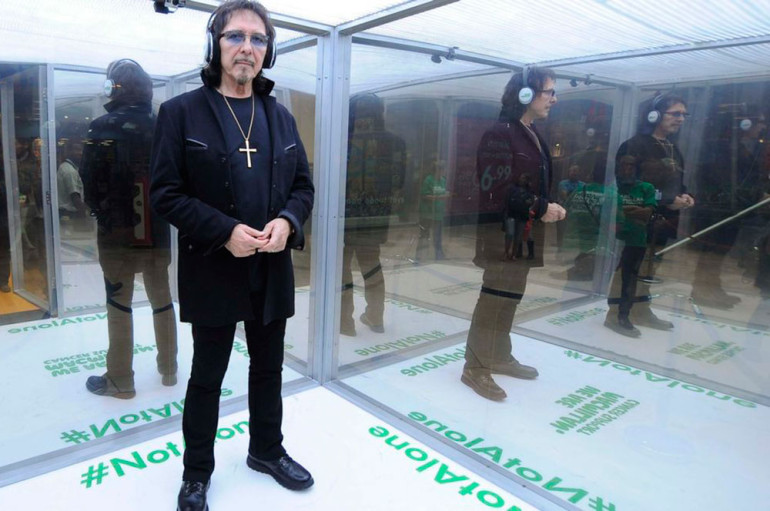 El legendario músico inglés Tony Iommi se hizo parte de una campaña de concientización acerca del cáncer participando en una actividad en la que tuvo que “encerrarse” en una cabina de vidrio.